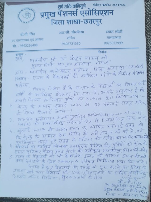 छतरपुर। प्रमुख पेंशनर एसोसिएशन संगठन छतरपुर शाखा द्वारा प्रांतीय निर्देश पर अपनी उपरोक्त मांगो के समर्थन मे प्रमुख पेन्सनर्स एसोसिएशन छतरपुर अध्यक्ष बी पी सिंह और उनकी संगठन की टीम द्वारा माननीय मुख्यमंत्री महोदय को श्रीमान कलेक्टर महोदय छतरपुर के माध्यम से आज दोपहर ढाई बजे सागर रोड स्थित मुख्य द्वार से एक विशाल रैली के माध्यम से ज्ञापन सौंपेगा।