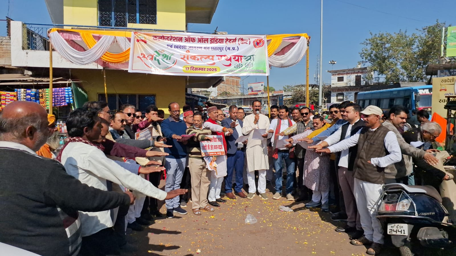छतरपुर। कैट (कन्फेडरेशन ऑफ ऑल इंडिया ट्रेडर्स) एवं स्वदेशी जागरण मंच के संयुक्त तत्वावधान में बुधवार को शहर में स्वदेशी संकल्प रथ यात्रा निकाली गई। यात्रा का शुभारंभ उत्कृष्ट विद्यालय क्रमांक-1 परिसर से किया गया।कैट के जिला अध्यक्ष आनंद अग्रवाल ने बताया कि बुधवार सुबह करीब 10 बजे उत्कृष्ट विद्यालय क्रमांक-1 में आयोजित सभा में उपस्थित नागरिकों एवं व्यापारियों को स्वदेशी वस्तुएं अपनाने की शपथ दिलाई गई। इसके पश्चात स्वदेशी संकल्प रथ यात्रा शहर भ्रमण के लिए रवाना हुई। रथ यात्रा उत्कृष्ट विद्यालय क्रमांक-1 से प्रारंभ होकर छत्रसाल चौराहा, चौबे तिराहा, बस स्टैंड एवं चौक बाजार से होते हुए पुन: छत्रसाल चौक पहुंची, जहां इसका समापन किया गया। यात्रा के दौरान लोगों से स्वदेशी उत्पादों के अधिक से अधिक उपयोग एवं विदेशी वस्तुओं के बहिष्कार का आग्रह किया गया। इस अवसर पर बड़ी संख्या में व्यापारी, संगठन के पदाधिकारी एवं नागरिक उपस्थित रहे।